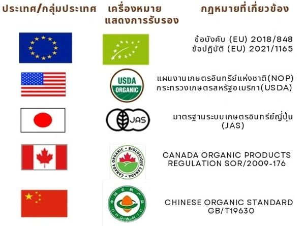 ดังจะเห็นได้ว่าเพียงแค่ทวีปอเมริกาเหนือ และทวีปยุโรปรวมกันมีมูลค่าการตลาดสูงถึง 87.7 % ของตลาดสินค้าเกษตรอินทรีย์ทั่วโลก ซึ่งการส่งออกสินค้าเกษตรอินทรีย์ไปยังทั้ง 2 ทวีปต้องได้รับการรับการรับรองมาตรฐานเกษตรอินทรีย์ตามกฏหมายภาคบังคับของประเทศปลายทาง