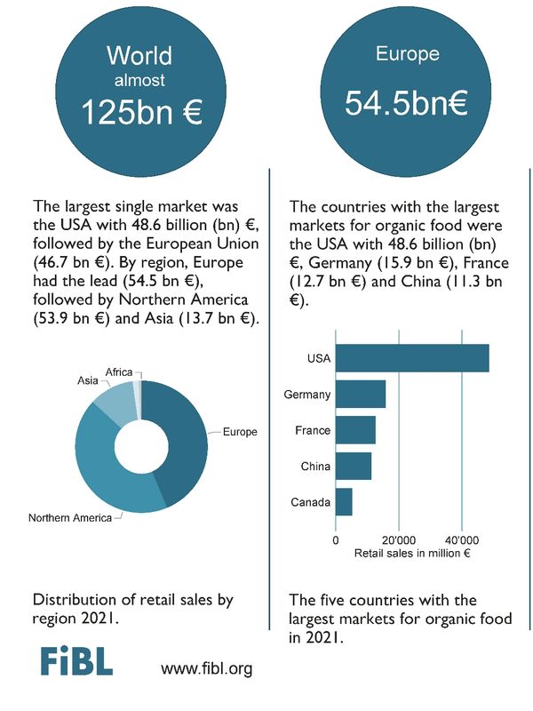 มีมูลค่า 53.9 พันล้านยูโร และ ทวีปเอเชีย 13.7 พันล้านยูโร เมื่อพิจารณาตลาดสินค้าเกษตรอินทรีย์จากมูลค่าโดยรวมของตลาดในแต่ละประเทศ พบว่าประเทศสหรัฐอเมริกามีมูลค่าการตลาดสูงที่สุดคือ 48.6 พันล้านยูโร รองลงมาคือ ประเทศเยอรมนี ฝรั่งเศส และจีน (Source: FiBL survey 2023)