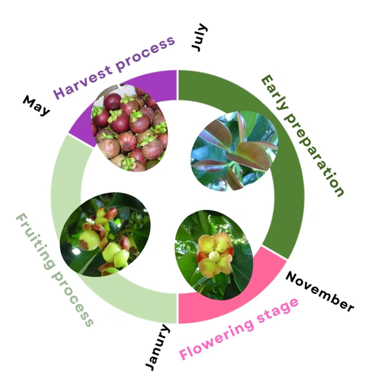Harvest using tools that prevent mangosteen fruit from falling off or violent impact, being careful not to break the terminals or bruise the calyx. Choose to collect only fruits that have ripe only at the pedigree stage.